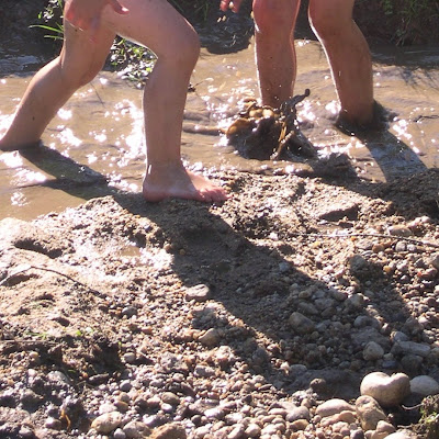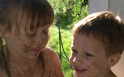 few days ago the kids discovered that the large mud puddles in our backyard  that I wrote about earlier are good for more than simple squishing between the toes.  We found them . . . jumping off of a small hill and into the puddle, practicing their “swimming,” digging, sculpting, and generally having a wonderful time.  It’s one of those things that you just simply can’t get away with as an adult, but kinda’ wish you could.